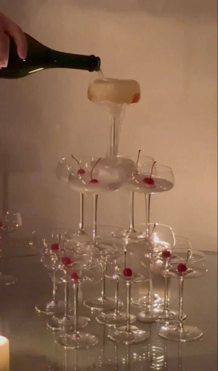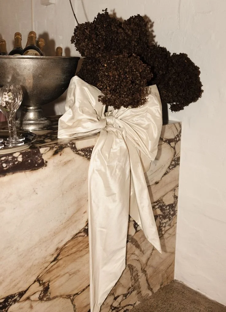 Put a bow on it! I just picked up a few lovely spools of black and cream ribbon and all month long I’ll be putting bows on everything! Champagne coups, invitations, menus, flatware, olive pedestals…